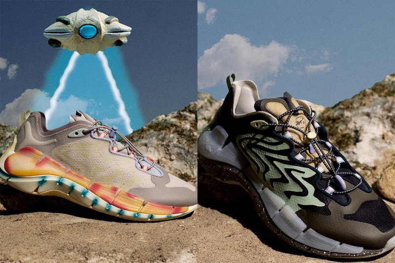 The collaboration entails a duo of busy makeups including gray and black colorways, both of which are styled with UFO sensibility inspired by Japanese Sofubi Kaiju toys. The lighter-toned offering sees through to a mostly gray upper and comes decorated with swirly mid-foot patterns that contrast with a matte gold finish. Faint touches of lilac also spill onto the lace toggles and borders of the throat, in addition to orange stripes that poke out through the lace loops. Double stacked midsoles continue the vivid energy by alternating between orange tie-dye patterns up top and teal graphics down below.