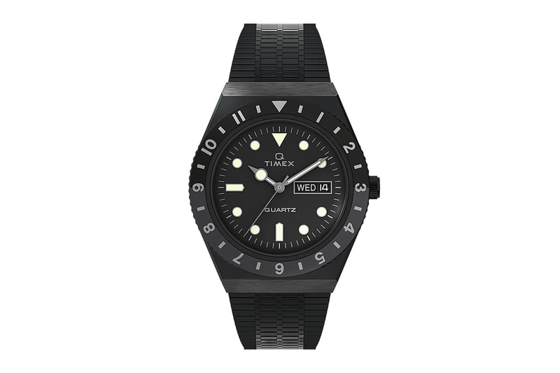 The model was first released in 1979, but this new colorway gives the watch's vintage design a sleeker look. It sports a black rotating bezel, face and stainless-steel bracelet, complemented by a domed acrylic crystal. "Q Timex" branding is etched near the top of the face, accompanied by light glow-in-the-dark details and a simple date calendar. The watch comes with 50 meters of water resistance and it features Quartz analog movement to complete the design.