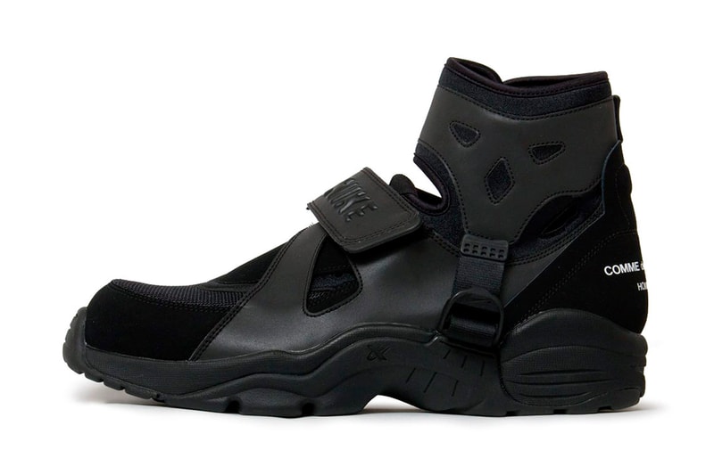 Coming in tonal "Black" and "White," the latest in the duo's collaborative relationship reimagines the retro mid-top model debuted in 1993. Maintaining the signature elements of the shoe, the COMME des GARÇONS HOMME PLUS rework is centered around an understated appeal defined by a mesh, neoprene and matching leather construction. Detailing comes in the form of a "NIKE" branded strap, adjustable strap, contrast COMME des GARÇONS HOMME PLUS printing at the rear and printed insoles. Elevating the shoe is a traction focussed sculpted cross-training sole unit.
