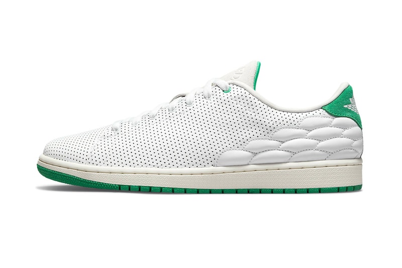 "AIR JORDAN” branding is debossed at the top of the shoe, over a smooth suede tongue. Most of the body is kept white, covered by perforations from the ankle all the way to the toebox. There's a vibrant cloud-like pattern at the rear quarter, above which a green suede heel tab is stamped with Jordan Brand’s winged “AIR JORDAN” logo. All of these details rest over a retro-inspired cream-colored midsole to complete the minimal colorway.