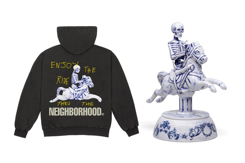 Leading the Cactus Jack for NEIGHBORHOOD team-up is the Carousel Incense Chamber which builds on the Japanese imprint's signature lifestyle item series. Coming in a classic mix of porcelain white with blue accents, the macabre chamber sees a skeleton riding a carousel horse on top of a co-branding and "ENJOY RIDE" marked base. Lifting the base there is a place sculpted to hold an incense cone to safely burn and billow out smoke from cleverly placed openings.