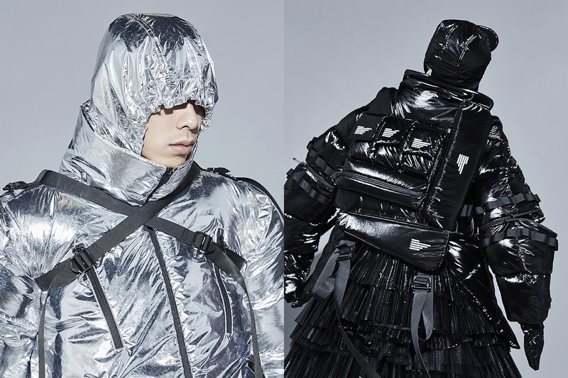 Dubbed "Nothing," the pieces are inspired by spaceships with outer futuristic motifs – billowing shapes nod towards astronauts' space suits in metallic silver and black. Padded construction, baggy layering and glossy overlays are seen in the black jacket. One noteworthy piece is the gray baggy jacket and pants printed with white grids and strokes of Chinese calligraphy and highlighted by lime dots to mimic the cosmos.