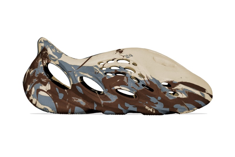 The upcoming take on the unique footwear style is centered around a light tan hue accented by a camo-like print. The adidas YEEZY Foam Runner features a one piece sculpted design defined by dynamic lines that highlight the material construction. While the swirls of color surrounded the oval airflow holes that provide ventilation, while a treaded sole rounds up the design of the shoe.