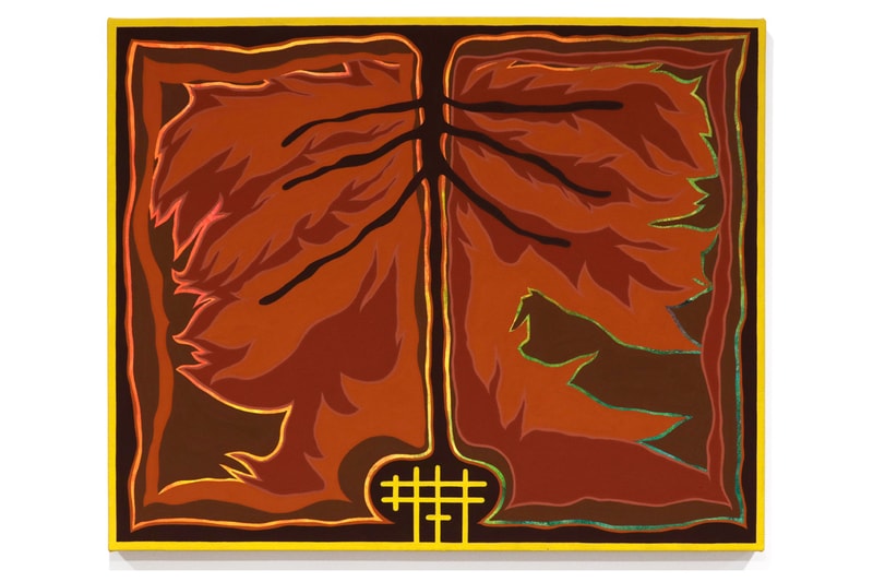 As her second solo exhibition with the gallery, formerly known as VICTORI + MO, the work on display is ambiguous in its thematic scope — a departure from the singular message of her last "Meetinghouse" exhibition. The works on display in "Petals Signals" seem recognizable at first glance, almost inviting in their color and floral motifs. Yet, upon further inspection, the work unfolds unsettling forms that take visual cues from her influences across horror and science-fiction movies, Japanese yukata (kimonos), art deco architecture to Shaker drawings and old colonial sketches of trees and plants.