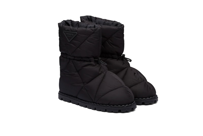 The luxury house has crafted a pair of black padded nylon fabric booties, which are reminiscent of cozy winter jackets. The booties come to life by a quilted motif that references the house's infamous triangle logo. Additionally, the booties feature technical details such as a drawstring closure, making them easy to slip in and out of, and a light EVA lug sole. Completing the silhouette is Prada's triangle logo reimagined in embossed rubber, which appears on the outside of the booties.