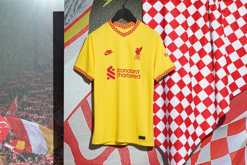 The jersey features a bright yellow base, referencing previous away shirts from Liverpool's history. This is contrasted with a red-and-yellow chequered trim on the collar as a nod to the flags of the Kop, and subtle pinstripes.