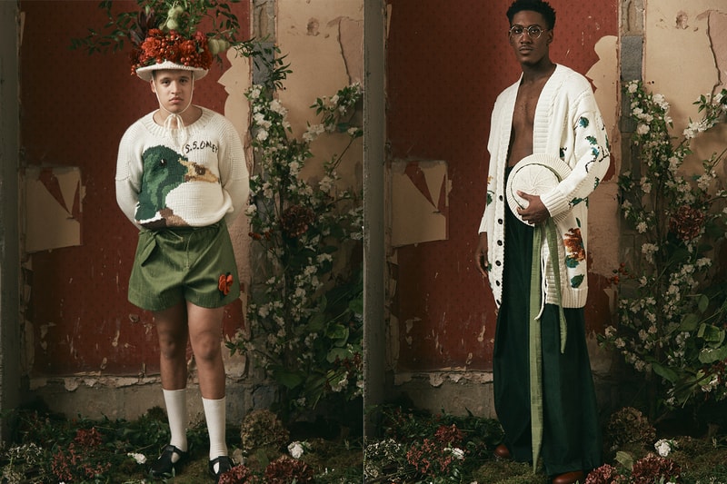 Moving on, masculinity is explored with high-waisted rugby shorts -- which are inspired by vintage kits from a team from Leeds -- while more flesh is on show thanks to a collection of vintage men's bathing suit-like vests. Daley’s recent obsession with handmade tapestries informs a standout oversized handknit cardigan that blooms with sunflowers, while the next vignette becomes even more personal as the designer has worked with a traditional silk mill in Yorkshire to create his own blue and gold-centric paisley print.