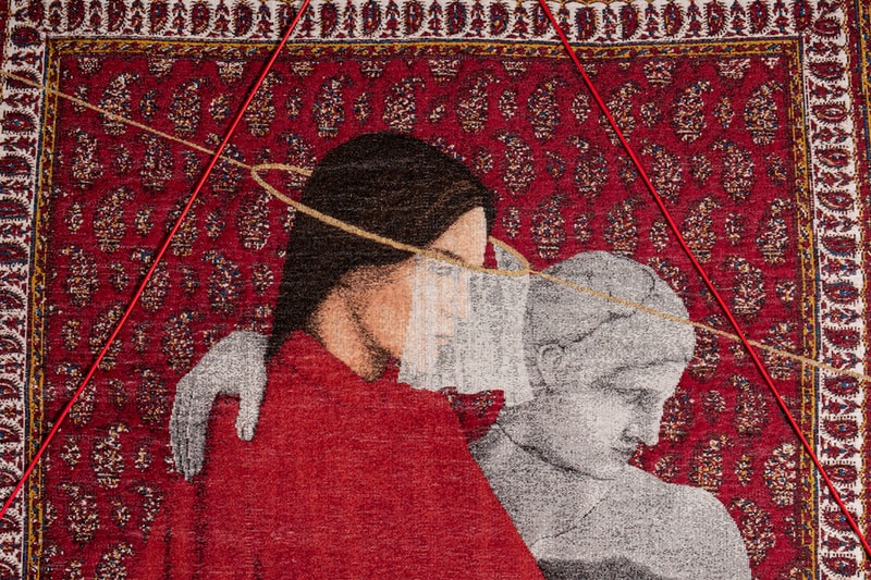 The artist has collaborated with Case Studyo on a new semi-biographical work, entitled "UNCERTAINTY." The artist has reappropriated an original painting she had made in 2020 using a timeless tradition of her background — Persian tapestry. Dating back over 2,500 years, Perisan rugs were first devised as a way to cover the ground for nomadic tribesmen who sought a sturdy base to combat the elements. They have since become a treasured art form that showcases everything from one's history, the town they are from to the traditions that have formed over the years.