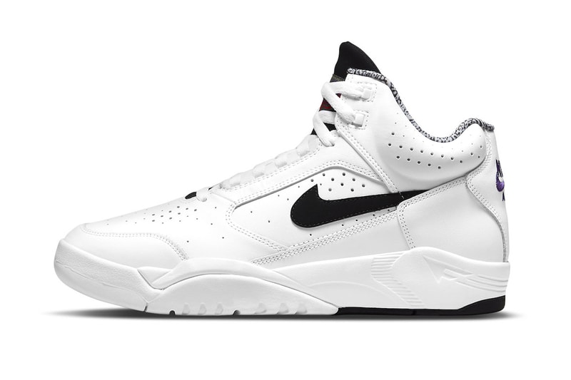 Making a comeback in a new decade, the design is constructed with clean white leather uppers featuring details in stark black hitting the main lateral Swooshes, tongue and partial outsole. A graphic interior lining peeps out from the ankle collar while the insoles are decorated in purple and orange. Perforations run throughout the uppers for added breathability and the heel branding is stitched in purple to complete the look.