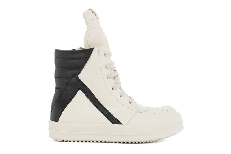 Coming in "Milk" colorways with varying hits of black, the sneakers are smaller recreations of the full leather high-tops that have become synonymous with the Rick Owens brand. The shoes come complete with the same overlays, extended tongue, side zipper, badges and tags, off white colored laces and aggressive lugged sole units.
