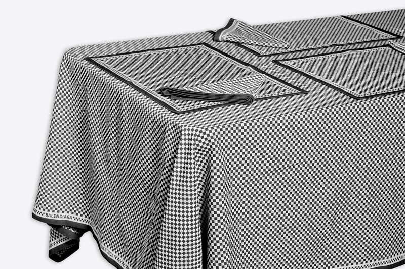 Balenciaga's novel Bistro Table Set includes one rectangular tablecloth, six placemats, and six napkins made with natural cotton. The items feature a uniform jacquard print and Balenciaga logos along the edges for a clean and simple two-tone look. Other items currently in the Balenciaga "Objects" collection include expandable shopper bags, water bottles, travel pillows, and sneaker laser cubes.